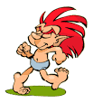 tem os cabelos vermelhos e os pés voltados para trás, ele tem os pés dessa